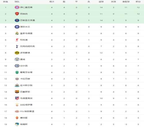 欧冠最新积分榜排名: